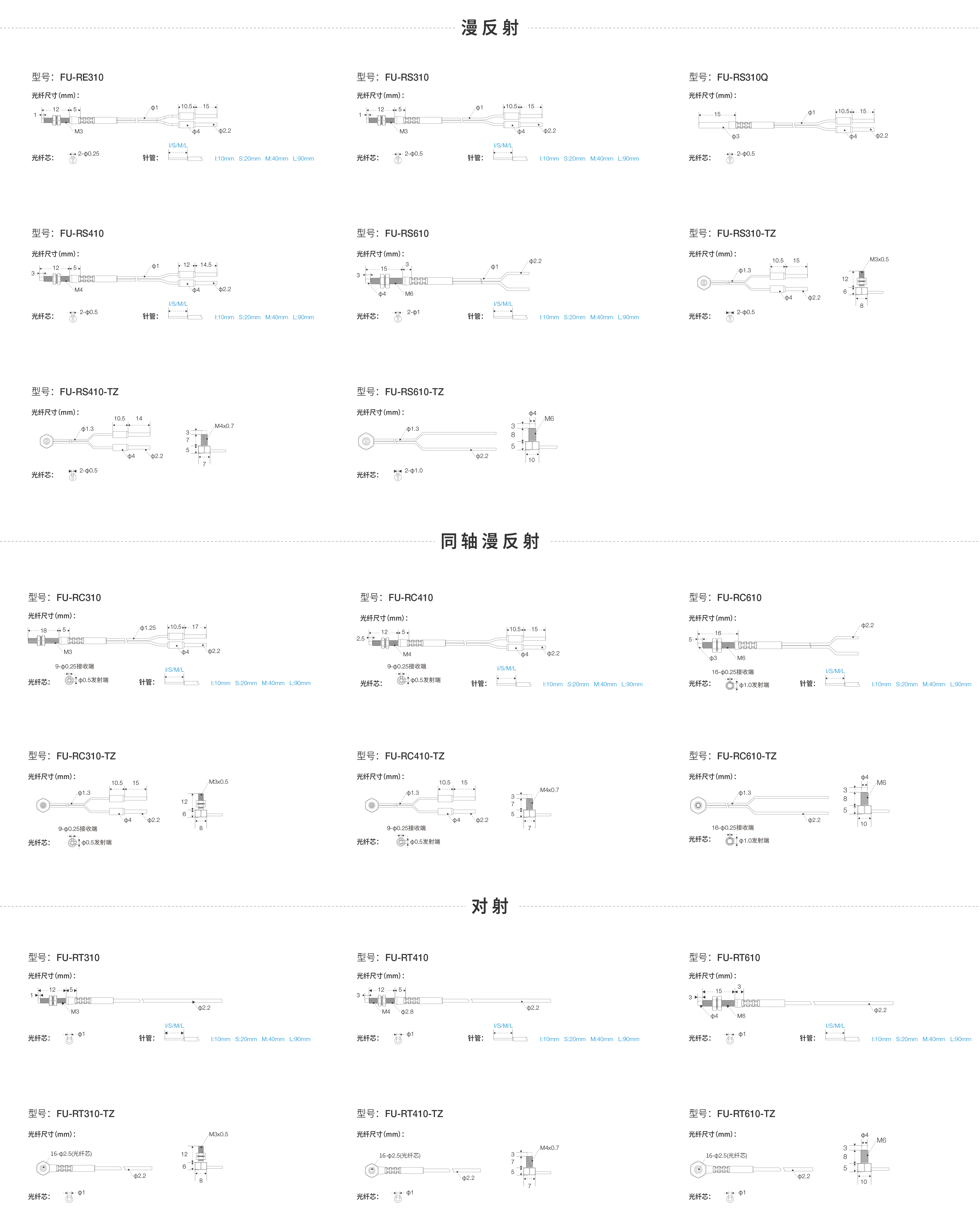FU-RC410-TZ | M4*15.5 | 70mm±10% | 0-56mm | 纤芯0.5mm*1条 | 纤芯0.25*9条 | -25~+70℃ | R25mm | 塑料 | 直径0.5mm | 不锈钢 |
